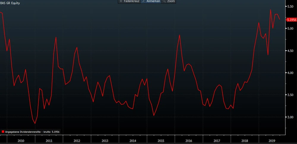 Interessant: Dafür liegt aktuell die Dividendenrendite so hoch wie zuletzt in Zeiten der Finanzkrise 2008/09. Denn da das Gros der Analysten für das kommende Jahr mit einer weiteren Anhebung der Ausschüttung um 0,10 auf dann 3,20 Euro rechnet, können die Anteilseigner 2020 auf eine Rendite von stattlichen 5,2 Prozent kommen: