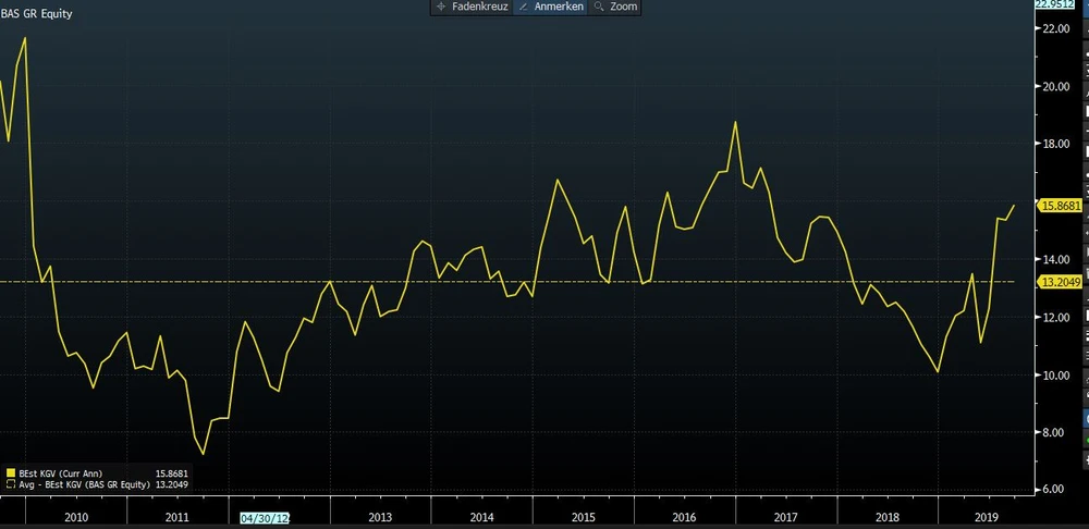Blickt man auf die Bewertung anderer deutscher Chemieaktien, so muss man feststellen, dass die BASF-Anteile im Branchenvergleich nicht gerade günstig sind: So liegt das 2019er-KGV bei BASF aktuell bei 16, das 2020er-KGV bei 14. Sowohl Covestro als auch Lanxess und Evonik liegen bei diesen Kennziffern darunter.