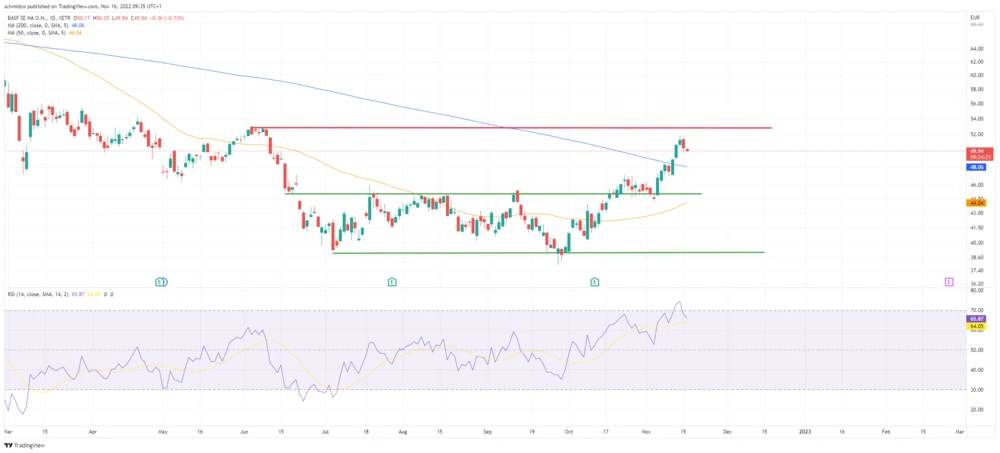 Als die BASF-Aktie über die Waagerechte bei 45 Euro geklettert ist, hat sie den Doppelboden vollendet, welches sie mit den zwei Tiefs bei knapp 39 Euro ausgebildet hatte. Nun hat sie das rechnerische Ende der Formation bei 51 Euro erreicht.