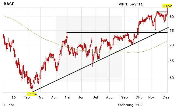 In einem nach dem gestrigen Referendum in Italien doch überraschend freundlichem Marktumfeld legt die Aktie von BASF kräftig zu. Der DAX-Titel springt sogar auf ein neues Jahreshoch und hat damit ein weiteres Kaufsignal generiert. Hauptgrund hierfür dürfte eine deutliche Kurszielanhebung von Merrill Lynch sein.