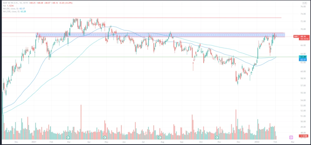 Der Bereich zwischen 68 und 69 Euro erwies sich für die BASF-Aktie bereits in der Vergangenheit als hartnäckiger Widerstand. Zuletzt ließ sie ihn im März 2021 hinter sich und markierte bei knapp 73 Euro ein neues Hoch. Nun steht das Papier vor der gleichen Aufgabe.