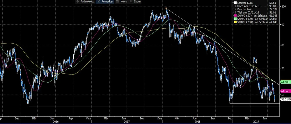 So war es natürlich rein charttechnisch betrachtet bitter, dass die Unterstützung von 58 Euro am Freitag gerissen wurde. Zwar konnte sich der Blue Chip im weiteren Handelsverlauf wieder über diese Marke hieven, dennoch hat sich das Chartbild dadurch etwas weiter eingetrübt.