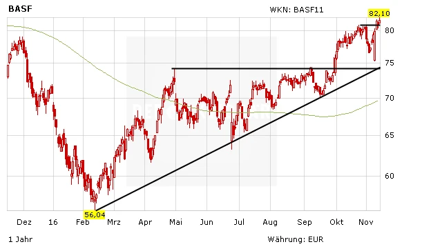 Die Aktie von BASF am ersten Handelstag der neuen Börsenwoche einen guten Start hingelegt. Die Anteilscheine des weltgrößten Chemieriesen kletterten wohl auch durch den Rückenwind solider Konjunkturdaten aus China und Japan erstmals in diesem Jahr über die Marke von 82,00 Euro und markierten damit ein neues Kaufsignal.