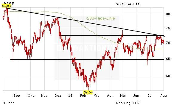 Seit Monaten pendelt die BASF-Aktie bereits im Bereich zwischen 65 und 72 Euro. Nach den Zahlen in der vergangenen Woche hat sich daran zunächst nichts geändert. Im freundlichen Marktumfeld nähert sich der DAX-Titel am Montag aber der oberen Begrenzung des Seitwärtskorridors. Die Experten sind sich allerdings nicht sicher, ob der Ausbruch wirklich gelingt.