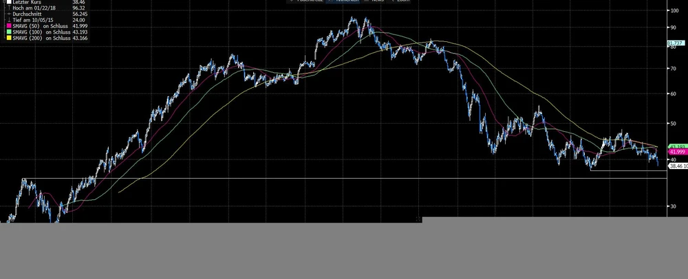 Bei Covestro ist nun auch eine wichtige Unterstützung gerissen worden. Jetzt ist die Wahrscheinlichkeit hoch, dass es zu einem Test des Mehrjahrestiefs von 37,30 Euro kommt. Hält diese Marke nicht, könnte es zunächst bis auf 35,50 Euro abwärts gehen.