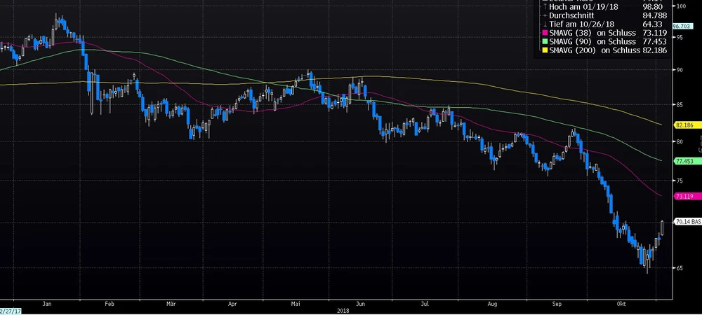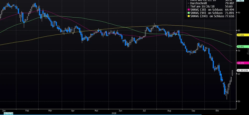 Bei der ehemaligen Bayer-Tochter konnten ausgehend vom letzte Woche markierten Tief bei 50,60 Euro nun bereits mehr als zehn Euro gut gemacht werden. Allerdings notierten die DAX-Titel Anfang des Jahres noch bei 95,78 Euro und Ende September noch zumindest bei über 70 Euro.