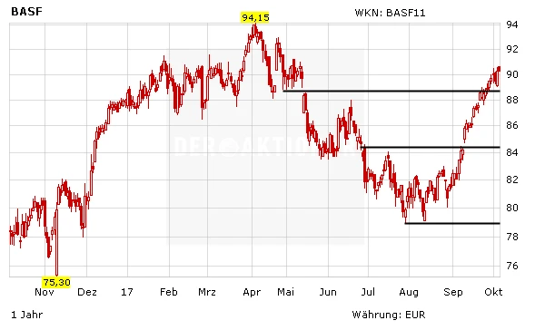 Von den 32 Experten, die sich regelmäßig mit den BASF-Papieren befassen, raten aktuell 18 zum Kauf. Zwölf Analysten stufen die Anteile mit Halten ein, nur zwei empfehlen den Verkauf. Das durchschnittliche Kursziel liegt mit 92,83 Euro zwar nur noch knapp drei Prozent über dem aktuellen Kursniveau. Allerdings war die Tendenz bei den Kurszielen zuletzt deutlich steigend. Immer mehr Banken sehen den fairen Wert der Chemietitel bei mittlerweile 100 Euro (wie etwa die Baader Bank) oder mehr.