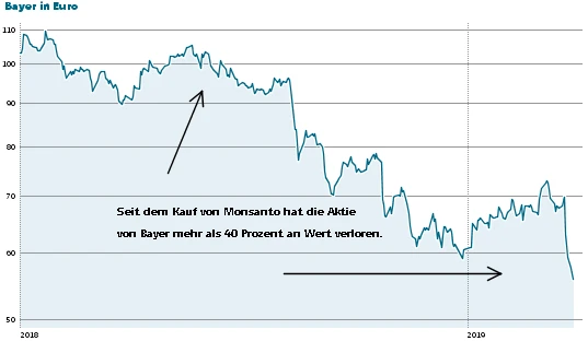 Hier musste Bayer erst vor wenigen Tagen vor einem Gericht in San Francisco einen empfindlichen Rückschlag hinnehmen, als die Jury einstimmig befand, dass das Produkt mit dem umstrittenen Wirkstoff Glyphosat ein wesentlicher Faktor für die Lymphdrüsenkrebserkrankung des Klägers gewesen sei. Der Aktienkurs des Pharma- und Agrarchemiekonzerns brach daraufhin ein und bröckelte seitdem weiter ab. Die Wahrscheinlichkeit steige, dass Bayer eine große Zahl der vielen Tausend Glyphosat-Klagen in den USA verlieren könnte, warnte deshalb Michael Leacock vom Investmenthaus Mainfirst. Er rechne aktuell mit rund elf Milliarden Euro an Rechtskosten für den Konzern.