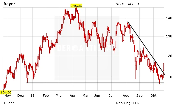 Zum Ende der Woche haben die deutschen Aktienmärkte deutlich an Fahrt aufgenommen. Auch die Papiere des Chemieriesen Bayer konnten sich inzwischen von ihren Tiefstständen lösen. Der Abwärtstrend wurde damit durchbrochen, nun hat sich das Bild beim DAX-Schwergewicht wieder deutlich aufgehellt.
