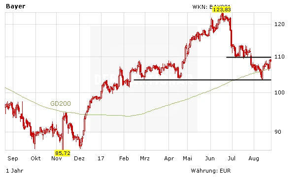 Aus charttechnischer Sicht hat die Bayer-Aktie immerhin die 200-Tage-Linie wieder zurückerobern können. Die nächste wichtige Hürde wartet nun bei 110 Euro. DER AKTIONÄR rät, bei Bayer angesichts der Monsanto-Problematik weiterhin außen vor zu bleiben.