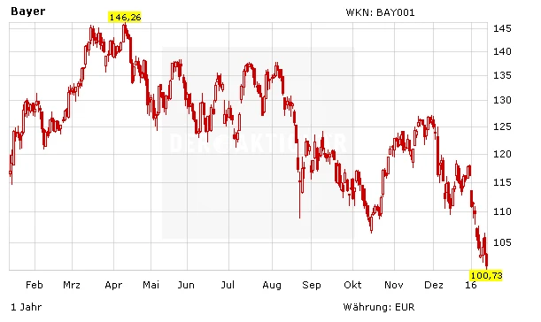 Das ohnehin angeschlagene Chartbild hat sich durch die erneuten Verluste noch einmal verschlechtert. Der Abwärtstrend seit dem Rekordhoch bei 146,45 Euro ist klar intakt. Zudem wurde die massive Unterstützung bei 107 Euro durchbrochen. Inzwischen notiert die Aktie auf dem niedrigsten Niveau seit über einem Jahr. Durch die anhaltende Talfahrt drohen bei Bayer sogar zunehmend zweistellige Kurse.