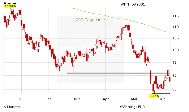 Die Aktie von Bayer ist im Zuge der Übernahmeankündigung von Monsanto verstärkt unter Druck geraten. Zuletzt konnte sich das Papier etwas erholen. Allerdings ist die Aktie am Widerstand bei 91 Euro nach unten abgeprallt. Damit hat sich das charttechnische Bild erneut eingetrübt. Anleger beachten unbedingt den Stopp bei 82 Euro.