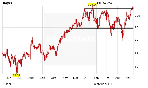 Charttechnisch ist der Ausbruch für die Bayer-Aktie zum Greifen nahe. Der leichte Abwärtstrend wurde durchbrochen, das Allzeithoch ist im Visier. Dank der anhaltenden Übernahmespekulationen in der Pharmabranche ist das Interesse der Investoren an Titeln wie Bayer derzeit groß. Sollte das DAX-Schwergewicht tatsächlich ins Blickfeld der zahlungskräftigen Konkurrenz geraten, würde der Kurs in die Höhe schießen.