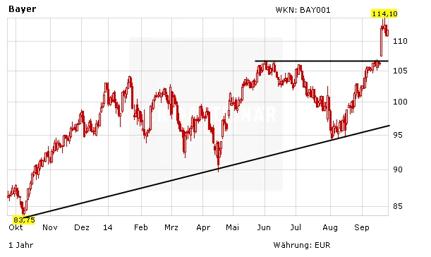 Die LBBW hat ihre Einstufung für Bayer auf „Halten“ belassen. Das Kursziel haben die Experten von 108,00 auf 115,00 Euro erhöht. Der geplante Börsengang von Bayer Material Science wird derweil unter neuer Führung geschehen. Ab 1. Oktober wird der ehemalige MAN- und Aldi-Süd-Manager Frank Lutz laut Handelsblatt neuer Finanzvorstand der Sparte. „Er wird Material Science mit seiner umfassenden Expertise auf den geplanten Börsengang vorbereiten“, so der Aufsichtsratsvorsitzende Werner Baumann.