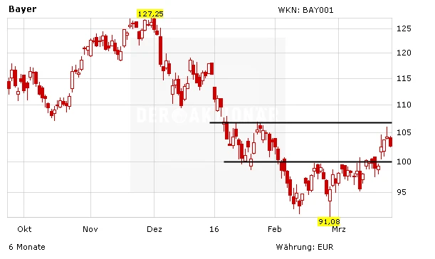 Die Aktie von Bayer ist zuletzt ordentlich in Bewegung gekommen. Den Startschuss dafür lieferte die Meldung, dass der US-Saatguthersteller Monsanto nach einem gescheiterten Übernahmeversuch in der Schweiz seine Angel nun in Deutschland auswirft. Es gebe mit Bayer Gespräche über das Geschäft mit der Agrarchemie, berichtete die Nachrichtenagentur Bloomberg am vergangenen Wochenende. Im Zuge dieser Meldung ist der Bayer-Aktie der Sprung über den Widerstand bei 100 Euro gelungen.