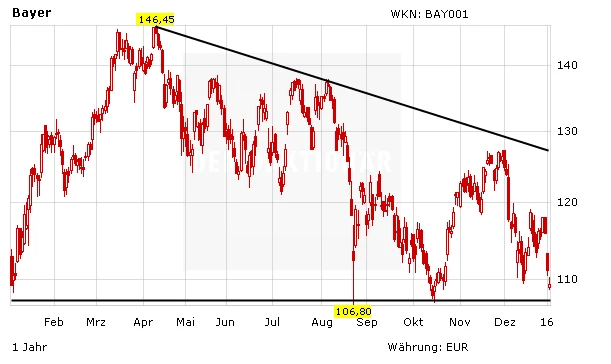 In den vergangenen Jahren galt Bayer stets als Garant für steigende Aktienkurse. Seit dem Hoch bei 146,45 Euro zeigt der Weg aber deutlich nach unten. Der Abwärtstrend ist deutlich intakt und hat sich in den vergangenen Wochen sogar noch einmal beschleunigt. Inzwischen notiert die Aktie nur noch knapp oberhalb des massiven Unterstützungsbereichs bei rund 107 Euro. Sollte diese Marke allerdings auch keinen Halt bieten, drohen auf Sicht sogar wieder zweistellige Kurse.