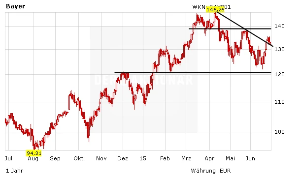 Charttechnisch bleibt die Lage bei Bayer derweil unverändert. Der kurzfristige Abwärtstrend wurde Anfang der Woche nach oben durchbrochen. Allerdings lässt der Angriff auf den Widerstand bei 139 Euro weiter auf sich warten. Im volatilen Gesamtmarkt pendelt die Aktie vielmehr nach wie vor zwischen 130 und 135 Euro. Nach unten sichert die Unterstützung bei etwa 121 Euro weiterhin vor deutlichen Rücksetzern ab.