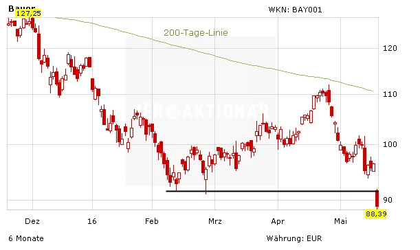 Die Aktie von Bayer befindet sich derzeit klar im Sinkflug. Mit dem heutigen Kursrutsch wurde auch das bisherige Jahrestief nach unten durchschritten. Damit befindet sich das Papier nur noch gut fünf Prozent über dem Stopp des AKTIONÄR bei 84,00 Euro. Dieser sollte aber in jedem Fall beachtet werden.