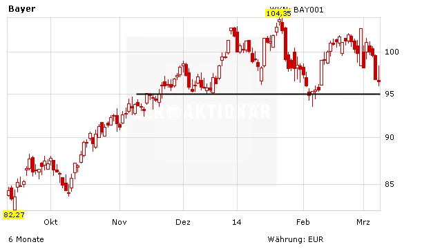 Die Aktien von Bayer sind am Montag mit einem Plus von 1,48 Prozent zunächst an die DAX-Spitze geklettert, mussten aber im Laufe des Tages wieder abgeben. Das Papier ging am Ende des Handelstages mit einem Minus von 0,28 Prozent auf 96,44 Euro aus dem Handel, damit belegte die Aktie aber noch immer Platz vier der bestperformenden Werte im DAX. Händler Andreas Lipkow vom Vermögensverwalter Kliegel & Hafner sagte, die Titel dürften als schwer gewichteter DAX-Wert derzeit ganz oben auf den Listen von Vermögensverwaltern stehen. Das mache die Anteile auch für andere Marktteilnehmer sehr begehrt.