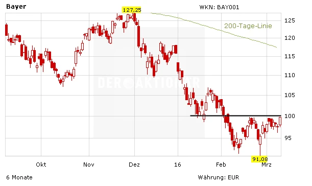Die Aktie von Bayer kann am heutigen Mittwoch in einem freundlichen Umfeld hohe Gewinne verbuchen. Der Wert gewinnt 2,2 Prozent auf 99,75 Euro und gehört damit neben der Münchener Rück und Fresenius zu den größten Gewinnern des Tages im deutschen Leitindex. Aus charttechnischer Sicht ist Bayer damit wieder nahe an die nächste insbesondere psychologisch wichtige Hürde von 100 Euro herangerückt. Gelingt der Sprung darüber, wäre dies als klares positives Signal zu werten. DER AKTIONÄR bleibt insbesondere hinsichtlich der im Peergroup-Vergleich günstigen Bewertung (2016er-KGV von 13) bei seiner Kaufempfehlung. Und auch Investoren, die Wert auf Dividendenkontinuität legen, haben mit Bayer einen Garanten dafür gefunden.