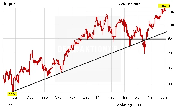 Charttechnisch hat die Bayer-Aktie nach dem Erreichen des neuen Allzeithochs weiter Platz nach oben. Gelingt es dem Titel, sich oberhalb der wichtigen 104-Euro-Marke zu behaupten, sind Werte bis zu 135 Euro möglich. Eine weitere Unterstützung bei knapp 95 Euro sichert den Kurs zudem nach unten ab.