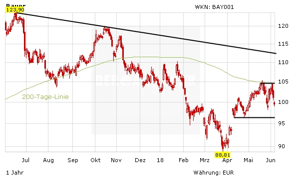 Durch den Abschlag ist die Bayer-Aktie im heutigen Handel erneut unter die psychologisch wichtige Marke von 100 Euro gerutscht. In den Handelstagen zuvor ist das Papier bereits an der Widerstandszone bei 105 Euro – wo auch die 200-Tage-Linie verläuft – abgeprallt.
