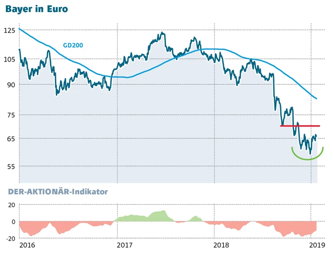 Vom Tief bei 58,34 Euro hat sich die Bayer-Aktie mittlerweile knapp 15 Prozent erholt. Wer auf die Gegenbewegung spekuliert hat, sichert die Position mit einem Stopp knapp unterhalb des Mehrjahrestiefs ab. Für ein größeres Engagement beim DAX-Konzern ist es noch zu früh.