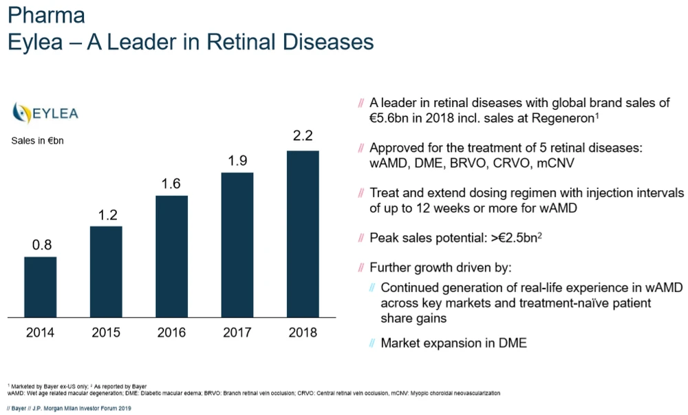 Hinter Xarelto wachsen auch die Eylea-Erlöse weiter. 2,2 Milliarden Euro setzte Bayer im vergangenen Geschäftsjahr mit dem Angiogenese-Inhibitor um. Das Medikament kommt unter anderem zur Behandlung der neovaskulären altersabhängigen Makuladegeneration (nAMD) zum Einsatz.
