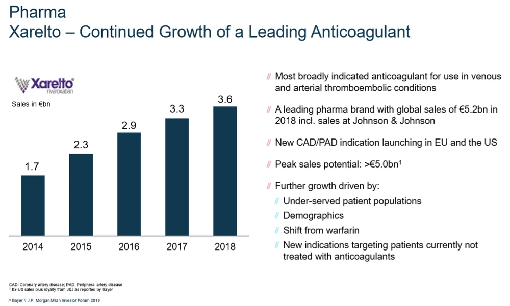Der Top-Seller Xarelto zählt zu den Wachstumstreibern im Produktportfolio der Pharma-Sparte von Bayer. Im Jahr 2018 steuerte der Blutverdünner satte 3,6 Milliarden Euro zum Umsatz bei.