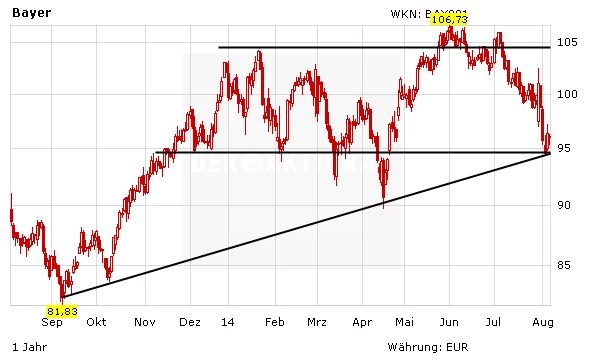 Charttechnisch hat sich das Bild bei der Bayer-Aktie zuletzt eingetrübt. Inzwischen notiert der DAX-Titel knapp oberhalb der wichtigen Unterstützung bei rund 95 Euro. Im schwachen Marktumfeld sollte es bald zu einem Test dieser Marke kommen. Fällt die untere Begrenzung des mittelfristigen Seitwärtskorridors, droht dann sogar ein weiterer Rücksetzer bis in den Bereich von 90 Euro.