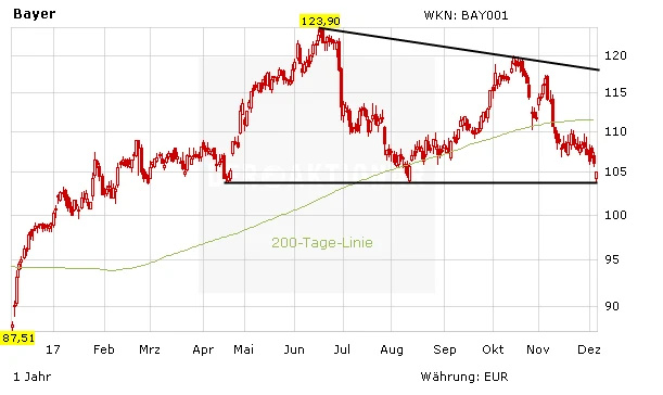 Der verlorene Prozess in den USA belastet und lässt die Bayer-Aktie auf den tiefsten Stand seit August abrutschen. Mittlerweile notieren die DAX-Papiere an der horizontalen Unterstützung bei 103,70 Euro. Fällt diese Marke, droht die Aktie weiter an Boden zu verlieren. Die nächsten Unterstützungen befinden sich bei 100,00 Euro sowie 98,00 Euro. DER AKTIONÄR bleibt bei seiner pessimistischen und kritischen Einstellung, was den DAX-Konzern angeht.