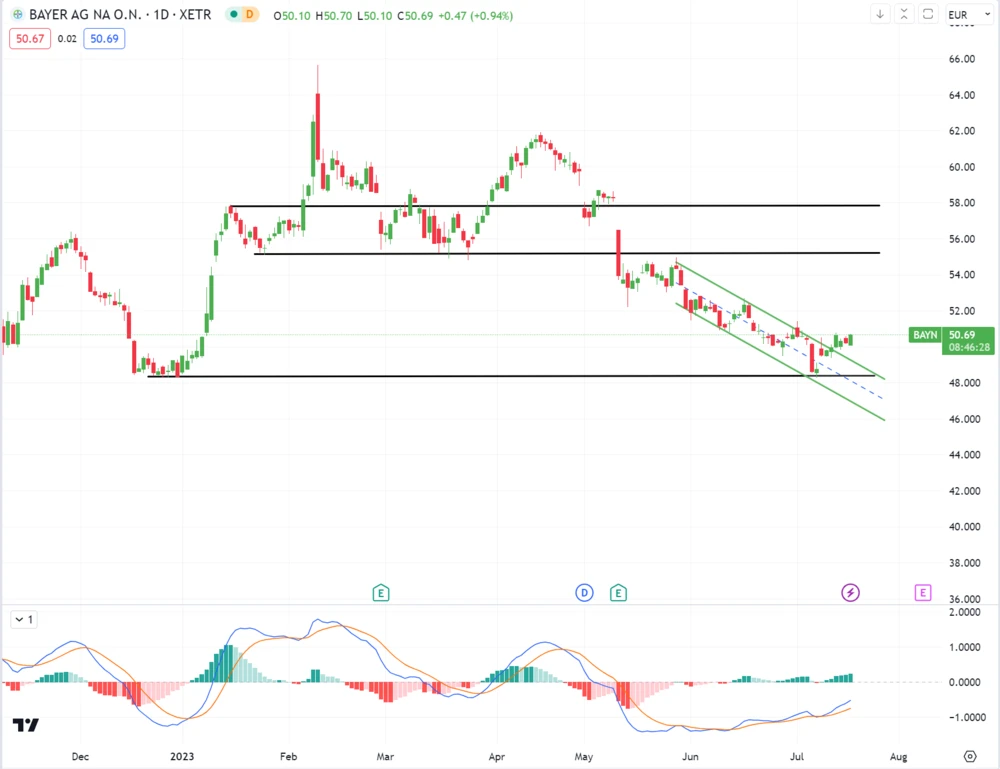 Mit dem Ausbruch aus dem seit Mai gültigen Abwärtstrendkanal hat der MACD-Indikator zeitgleich ein Kaufsignal ausgelöst. Somit stehen die Chancen auf eine Rückkehr der Bayer-Aktie zu alten Hochs gut.