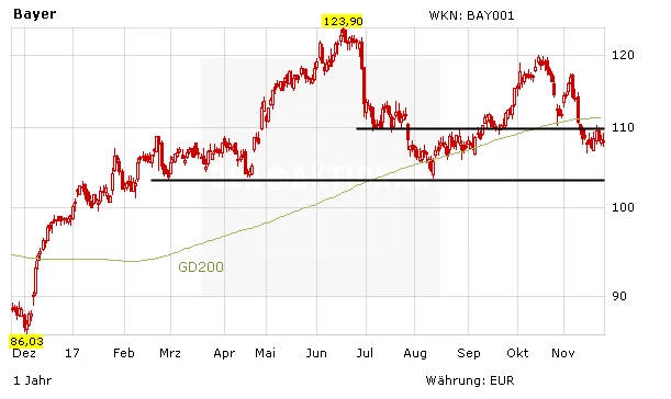 Die Aktie von Bayer ist zuletzt peu à peu gefallen und hat dabei auch die 200-Tage-Linie und den Support im Bereich von 110 Euro nach unten durchschritten. Wichtig ist nun die Verteidigung des Augusttiefs bei 103,70 Euro. Ein Rutsch darunter würde ein weiteres Verkaufssignal auslösen. DER AKTIONÄR sieht bei Bayer weiterhin keinen Handlungsbedarf. Insbesondere die geplante Übernahme von Monsanto belastet. Im DAX gibt es klar bessere Alternativen.
