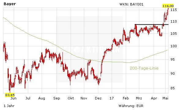 Unverändert stehen die Leverkusener in der Kritik: Neben Umweltschützern und Parteien bleibt auch DER AKTIONÄR skeptisch, was den Milliardendeal angeht. Die hohe Verschuldung durch die Akquisition von Monsanto birgt viele Risiken, die sich negativ auf die Bayer-Bilanz und die mittel- bis langfristige Dividendenpolitik auswirken könnten. Unbeeindruckt zeigt sich die Bayer-Aktie und klettert auf markiert ein neues Jahreshoch bei 116 Euro. Mittelfristig gibt es allerdings bessere Alternativen im DAX.