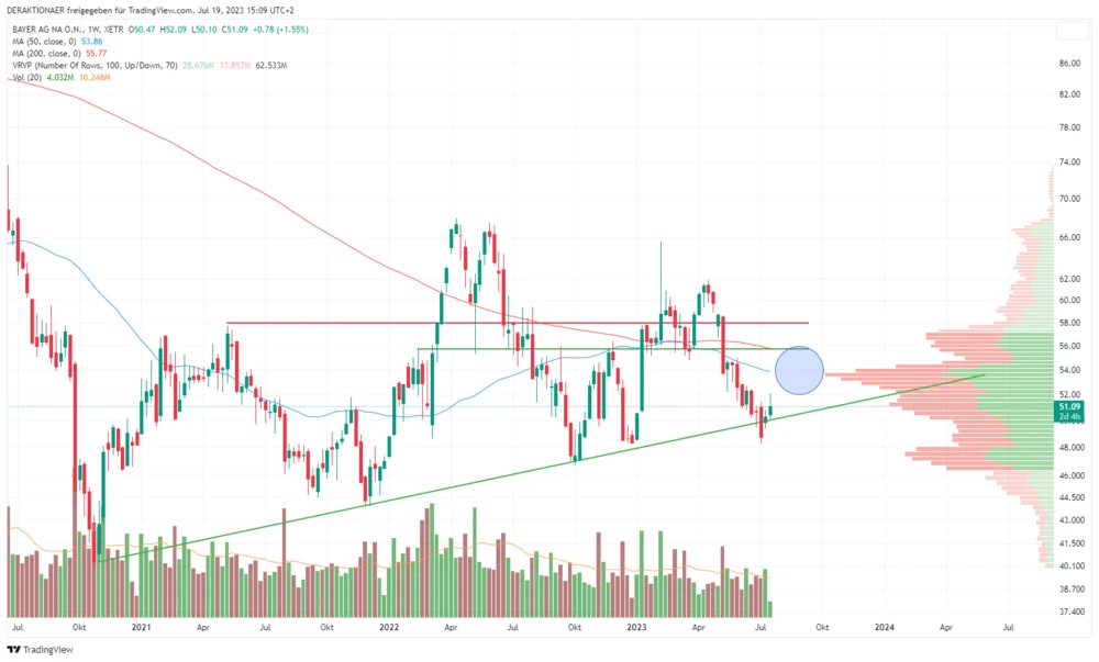 Der Bayer-Aktie haben die zuletzt positiven News gutgetan. Noch vor zwei Wochen drohte die mittelfristige Aufwärtstrendlinie bei 50 Euro nach unten gebrochen zu werden. Zwar schloss der Titel sogar schon zwischenzeitig unter diesem Support. Jedoch erwies dies sich in den folgenden Handelstagen als Fehlausbruch.