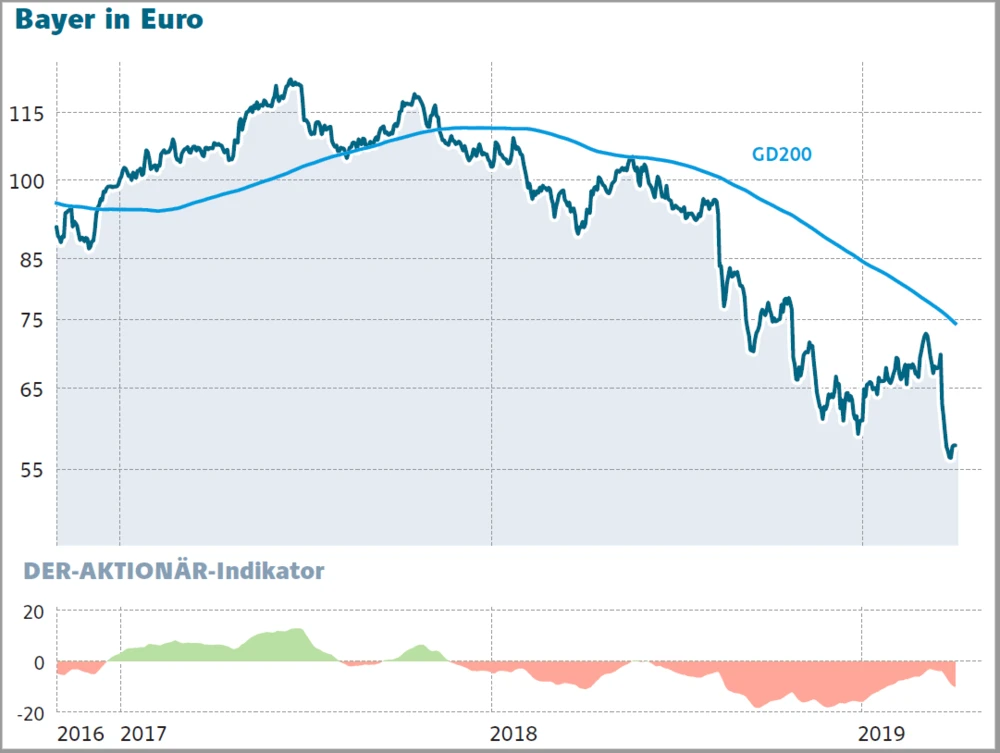 Durch die Übernahme von Monsanto wurde etwas in Gang gesetzt, was jetzt kaum noch zu stoppen sein dürfte. Das Bayer-Management hat sich mit allen gleichzeitig angelegt: Mit krebskranken Klägern und deren Anwälten, Geschworenenjurys, Umweltschützern und nicht zuletzt mit Großaktionären. Kurzfristig hat die massiv ausgebombte Bayer-Aktie dennoch charttechnisches Erholungspotenzial. Aus einer langfristigen Optik heraus kann jedoch angesichts der unkalkulierbaren Rechtsrisiken ein Verfall auf 30 Euro nicht gänzlich ausgeschlossen werden. Da der Health-Care-Konzern eine undurchsichtige Black Box bleibt, verharren vorsichtige Anleger weiter an der Seitenlinie.