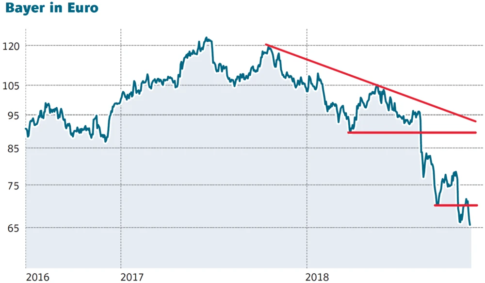 Der Kursverfall der Bayer-Aktie geht weiter. Zwar hat der DAX-Konzern im Rahmen der Zahlen zum dritten Quartal die zuvor bereits reduzierte Jahresprognose bestätigt und ergebnisseitig die Erwartungen übertroffen. Allerdings schwebt das Thema Glyphosat unverändert wie ein Damoklesschwert über der Konzernzentrale in Leverkusen. Die steigende Anzahl an Klagen gegen Monsanto drückt auf die Stimmung.