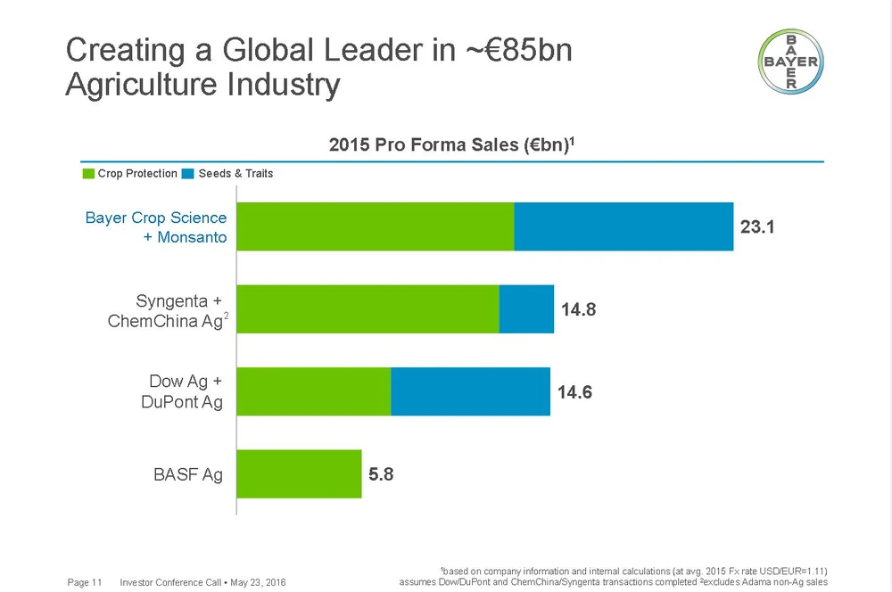 Mit 23,1 Milliarden Umsatz wäre BayerMonsanto der größte Agrochemiekonzern der Welt. SyngentaChemChina und DowDuPont würden auf Platz 2 und 3 verdrängt.