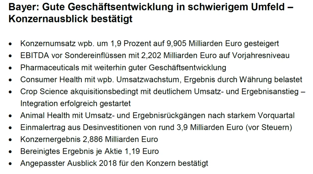 Bayer hat im dritten Quartal 2018 dank der Übernahme des US-Saatgut-Konzerns Monsanto und einem brummenden Pharma-Geschäft ein stabiles operatives Ergebnis erzielt. Den Ausblick für das Gesamtjahr bestätigen die Leverkusener. Allerdings sorgen sich Anleger weiter um die Klagewelle wegen dem umstrittenen Unkrautvernichter Glyphosat in den USA – per Ende Oktober stieg die Zahl der Kläger auf etwa 9.300. Das sind rund 600 Fälle mehr als zum August-Ende.