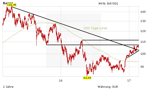 Die Papiere von Bayer legen nach dem Sprung über die 200-Tage-Linie weiter zu und konnten erste Hürden überwinden. Doch bei 112,00 Euro lauern der nächste hartnäckige Widerstand. DER AKTIONÄR bleibt weiterhin skeptisch, was die Übernahme des Saatgut-Riesen Monsanto anbelangt. Mittelfristig dürften weitere Kapitalmaßnahmen zur Finanzierung des Deals den Aktienkurs belasten und langfristig tiefe Spuren in der Bayer-Bilanz hinterlassen.