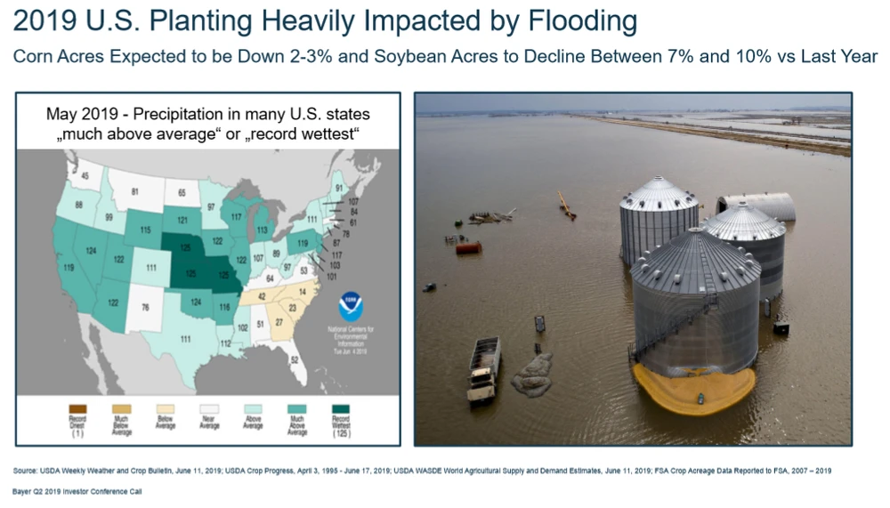 Die Markttrends in der nördlichen Hemisphäre dürften hingegen auch 2020 gedämpft bleiben mit entsprechenden Auswirkungen auf die Geschäfte der Agrochemiekonzerne. Im ersten Halbjahr 2019 hat das Crop-Science-Geschäft in Nordamerika unter schlechtem Wetter gelitten.