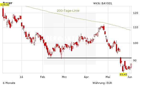 Während die Aktie von Monsanto von den Übernahmebestrebungen deutlich profitieren konnte – seit Anfang bei marschierte das Papier von weniger als 90 Dollar auf zuletzt über 110 Dollar –, hat die Bayer Aktie erhebliche Verluste einstecken müssen. Zuletzt hat sich die Aktie von Bayer allerdings stabilisieren können. Am Donnerstag gewann das Papier mehr als zwei Prozent, am Freitagmorgen legt die Aktie 0,1 Prozent auf 88,75 Euro zu. Allerdings trifft das Papier bei 91,00 Euro nun auf einen starken Widerstand. Anleger, die wie vom AKTIONÄR vor Kurzem empfohlen, auf eine Gegenbewegung spekuliert haben, bleiben weiter dabei, sichern aber ihre Position relativ eng ab.