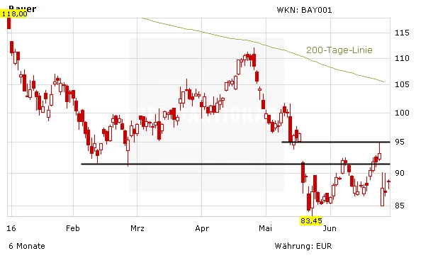 Es bleibt also spannend bei der geplanten Übernahme von Monsanto. Die Bayer-Aktie ist charttechnisch nach wie vor klar angeschlagen. In den vergangenen Monaten hat sie den DAX klar „underperformt“. Am heutigen Donnerstagvormittag verliert das Papier 0,5 Prozent auf 88,66 Euro. Im Bereich von 91 bis 95 Euro verläuft eine größere Widerstandszone. Mittelfristig bleibt die Aktie ein Verkaufskandidat. Investierte Anleger beachten den Stopp bei 82,00 Euro.
