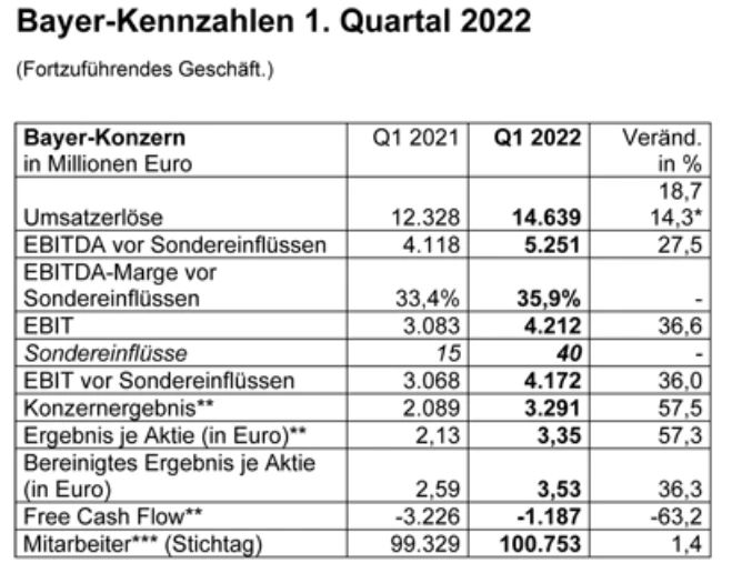 CEO Werner Baumann berichtet von einem "sehr gutes Umsatz- und Ergebniswachstum". "Vor allem unser Agrargeschäft hat erheblich zugelegt“, so der Manager. „Für den weiteren Jahresverlauf sind wir trotz der hohen Unsicherheit, unter anderem in Bezug auf die Stabilität der Lieferketten und der Energieversorgung, zuversichtlich und bestätigen die im März veröffentlichte währungsbereinigte Prognose für das Gesamtjahr.“