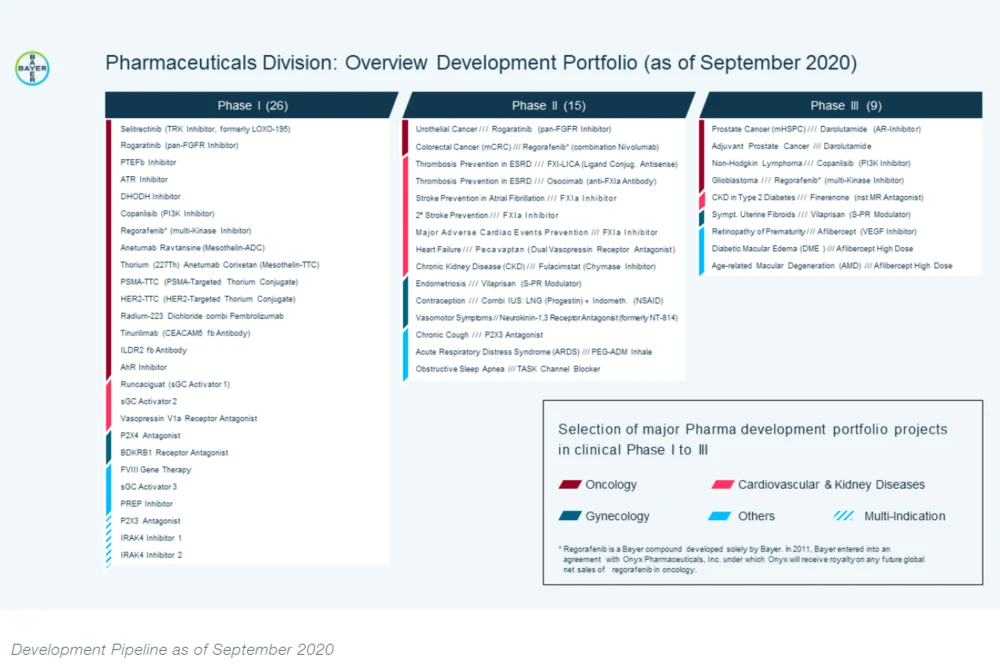 Für Bayer ist ein Erfolg neuer Medikamente wichtig, da in den kommenden Jahren der Patentschutz für wichtige Umsatzbringer wie den Gerinnungshemmer Xarelto und das Augenmedikament Eylea wegfallen. Gerade im Fall von Xarelto dürfte das nach 2024 beim Konzernumsatz laut Experten deutlich spürbar werden. Das Mittel steuerte 2019 mit 4,1 Milliarden Euro mehr als neun Prozent zum Konzernumsatz bei.
