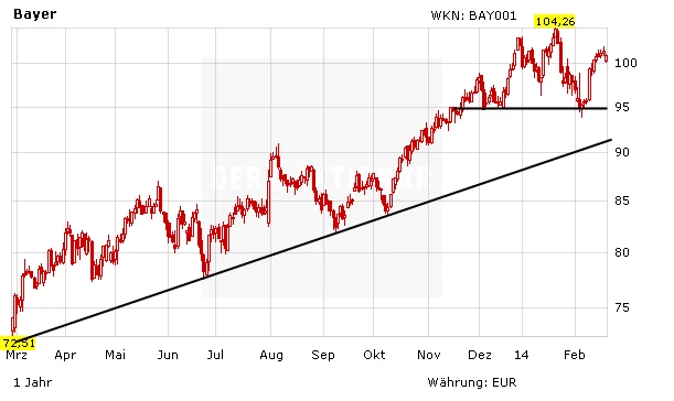 Die Aussichten bei Bayer sind nach wie vor gut. Das Unternehmen zählt zu den besten Werten in der Chemiebranche und auch der technische Aufwärtstrend ist weiterhin voll intakt. Gelingt der Ausbruch über das Allzeithoch bei gut 104 Euro, sind Kurse bis in den Bereich von 115 Euro möglich. Die stabile Unterstützung bei 95 Euro sichert die Aktie nach unten ab.