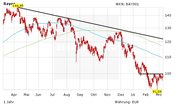 Die Fachleute von Börse Easy bemängeln, die Wachstumszahlen der Bayer AG für das vergangene Jahr sind vor allem wegen positiver Wechselkurseffekte so gut ausgefallen. Die Anleger ließen den Aktienkurs des Pharma- und Chemiekonzerns dennoch steigen. Die Fachleute und die Anleger sind sich allerdings einig: Die Aussichten passen. Der Vorstand erwartet im laufenden Jahr einen Umsatz- und Gewinnanstieg um einen mittleren einstelligen Prozentbetrag. Dabei dürfte dieses Ziel zu niedrig sein, damit Werner Baumann, der Dr. Marijn Dekkers zum 1. Mai als Vorstandsvorsitzenden ablöst, mit übertroffenen Jahreszielen glänzen kann. Statt des angestrebten Gewinns von 7,20 Euro je Aktie dürften es wohl eher 7,30 bis 7,40 Euro werden. Das Geschäft der Bayer AG läuft also und zudem lässt das KGV von 13 für dieses Jahr noch Luft für die Notierung nach oben. Das Kursziel beträgt 125 Euro.