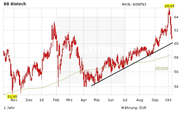 Anleger, die ein Einzelinvestment in Biotech-Aktien scheuen, liegen bei BB Biotech weiterhin goldrichtig. Die Aktie bleibt ganz klar das Basisinvestment in der Branche. Spannend wird es wieder am 19. Oktober. Dann veröffentlicht BB Biotech für das dritte Quartal.