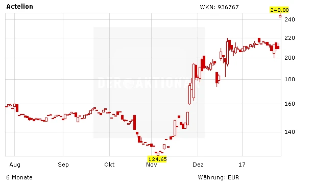 Johnson & Johnson war zwischenzeitlich schon einmal aus den Verhandlungen ausgeschieden, war am Dezember an den Tisch zu exklusiven Verhandlungen zurückgekehrt und verdrängte damit Sanofi, die ebenfalls Interesse an einer Übernahme hatten. Auch die Aktionäre von BB Biotech können sich freuen. Immerhin ist Actelion noch immer die viertgrößte Position im Portfolio der Schweizer Beteiligungsgesellschaft. BB Biotech gewinnt am frühen Morgen 2,5 Prozent. Das Papier bleibt das Basisinvestment im Sektor.