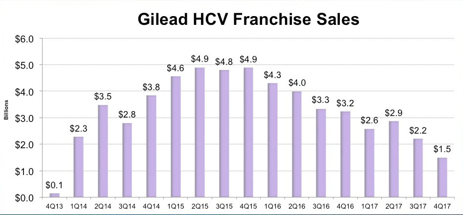 Immerhin hat Gilead im Jahr 2017 mit Hepatitis-C-Präparaten 9,2 Milliarden umgesetzt. 2018 kalkuliert der einstige Biotech-Shootingstar lediglich mit 3,5 bis vier Milliarden Dollar in diesem Bereich. Die anderen Bereiche in Form vom HIV- und Onkologie-Geschäft können diese rückläufigen Umsätze (durch auslaufende Patente und starker Konkurrenz) nicht kompensieren.